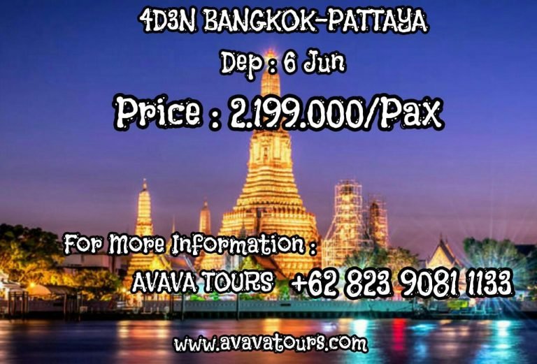 4D3N Bangkok – Pattaya Rp. 2,190,000/ pax 6 Juni Anak dengan bed, harga sama dengan dewasa Rp. 1,890,000/ pax 6 Juni Harga anak tanpa bed Meeting point : Pelabuhan Batam Centre Jam Keberangkatan : Majestic Ferry 07.30 ke Tanah Merah Jam kepulangan : Bebas Paket Termasuk Tiket Ferry Batam ke Singapore plus tax PP Transport darat selama perjalanan sesuai program Menginap 3 malam dihotel setara bintang 3 Tiket masuk ketempat wisata yang dikunjungi sesuai program 2x Makan siang, 3x sarapan pagi sesuai program ( halal food ) Lokal guide berbahasa Indonesia Paket Tidak Termasuk Tiket pesawat PP Makan dan minum diluar program Pengeluaran pribadi dan asuransi perjalanan Tip untuk guide Rp. 290,000/ orang Makan malam selama tour Destinasi Yang Dikunjungi Hari Pertama | No … Continue reading 4D3N